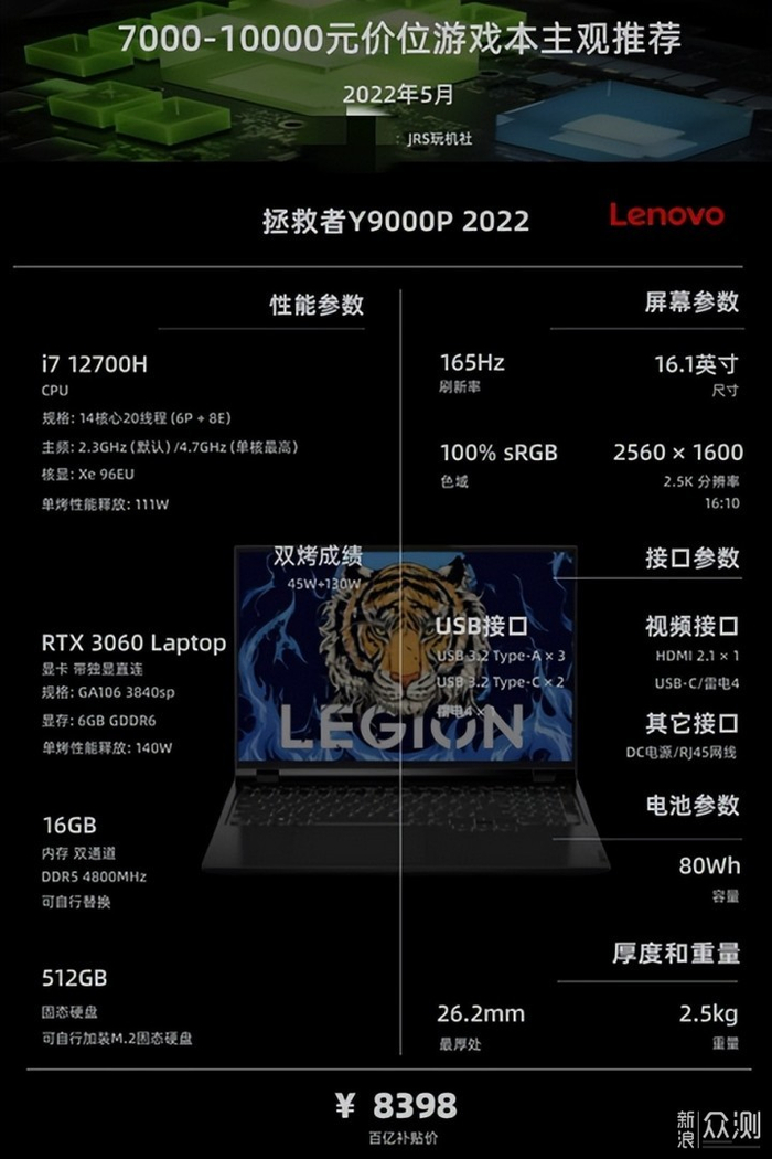 拯救者有货了!全新Y9000P 2022,这一代的散热进一步提升了,双烤能达到45W+130W,这一成绩是目前所有同价位RTX3060游戏本中表现最好的,此外该有的配置都有,配置上挑不出什么毛病,不过8400左右的价格,要比其他品牌的产品稍微贵一些。