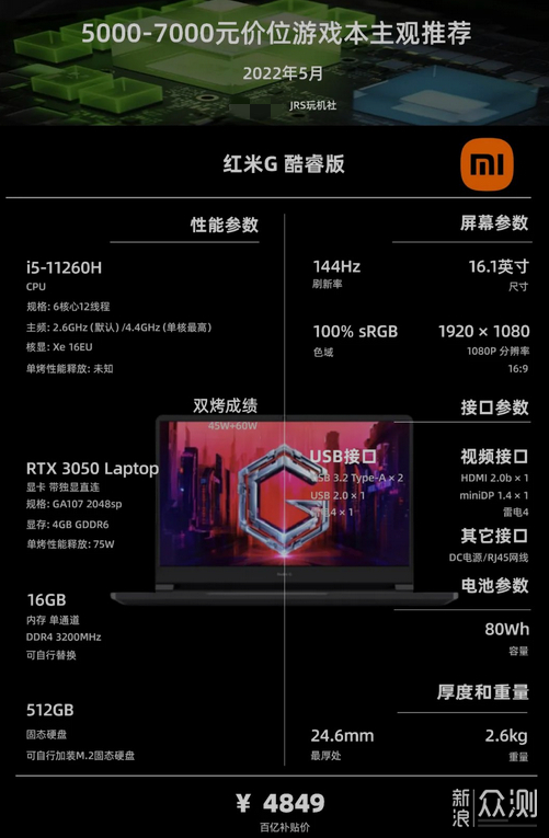 红米G拥有i5-11260H+RTX3050满血的基础配置,足以胜任绝大多数的网游画质全开,以及3A大作低-中画质以上的需求。整体配置非常均衡,还支持100W PD充电,屏幕也是144Hz的,缺点主要就是外观比较丑,大塑料的外壳质感较差。