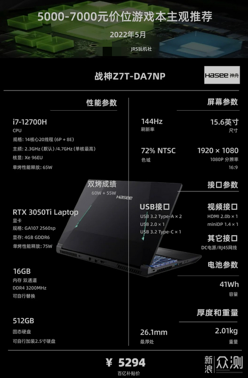 今年的5000-6000元档主流配置,就是i5-12500H+RTX3050/Ti,现在目前这个配置的本子都比较贵,性价比较为一般。比如华硕天选3,整体配置进步明显,但是跟同价位降价的RTX3060本子相比,性价比就有所不如了。神舟Z8是近期一款性价比非常突出的游戏本,i7-12700H+RTX3060的配置,还有2.5K屏幕,只要6200元不到!而且显卡还能刷130W的vBIOS。