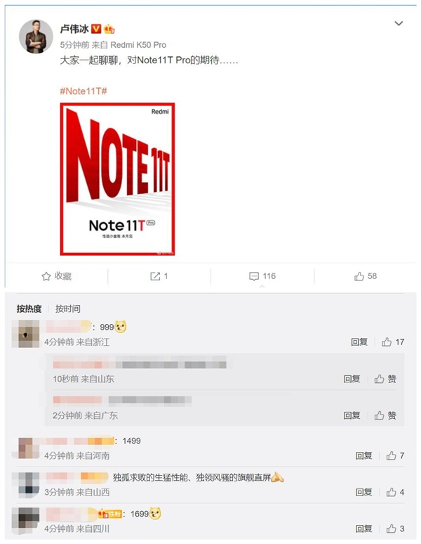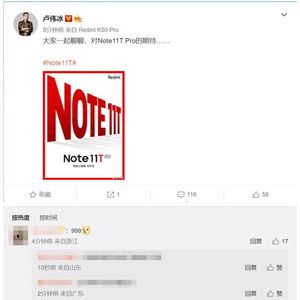 中端机性能之王!卢伟冰预热Redmi Note 11T Pro:米粉最期待价格