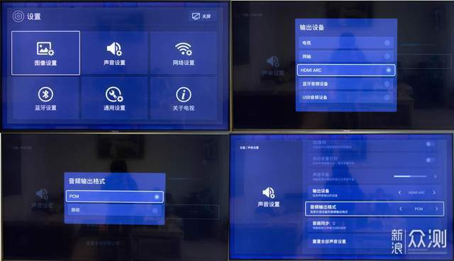 个人更加推荐使用HDMI接口与电视连接,毕竟已经附带了HDMI高清线,也就没有必要去准备其他线材了,毕竟方便才是硬道理。插上电源线,按下开机键,通过的信号源按钮将连接方式切换到[ARC]模式,然后将电视上的输出设备修改为HDMI ARC,并将音频输出格式修改为PCM(说明书中有这样的要求)。