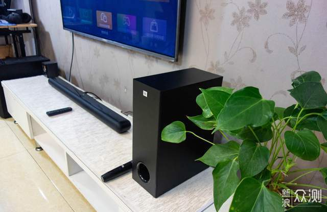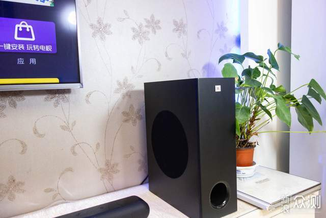 低音炮:低音炮相比条形主机要显眼的多:正面看去长度只有150mm,侧面看去宽度大概311mm,高度411mm。因此低音怕的高度与挂墙电视距离电视柜的高度相差无几,为了不遮挡电视屏幕我将它与一盘绿植一起放在电视柜的右侧。