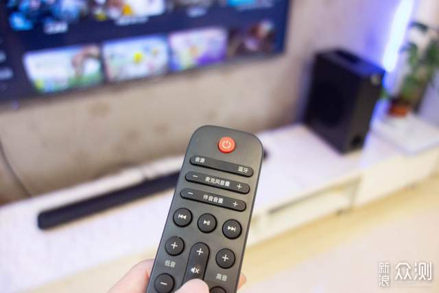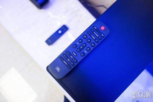除了主机上的实体按键,JBL CINEMA KTV350还有遥控器可用。它的最大操作距离是8米,一般家庭客厅的宽度是4米,所以平时坐在沙发上即可远程操作。