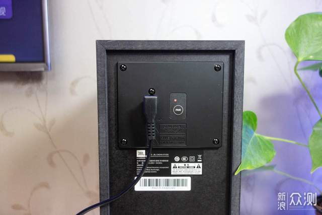 低音炮正面相当简洁一体黑色的外观,质感相当不错。摆放在电视柜上绝对拉升整体氛围感。可能是为了更加整洁的正面,低音炮的接口集中在背部。其接口较为简单:一个电源接口,一个PAIR配对按钮还有一个低音炮指示灯(配对成功会长亮)。