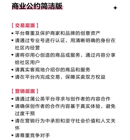 作为对去年4月发布的《社区公约》的重要补充,《社区商业公约》进一步针对平台商家和品牌进行了行为规范,具体包括引导商家品牌专业号认证经营、平台内交易,营销层面反对“虚假种草”,反对恶意竞争等等。