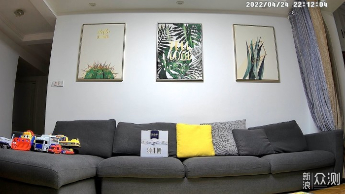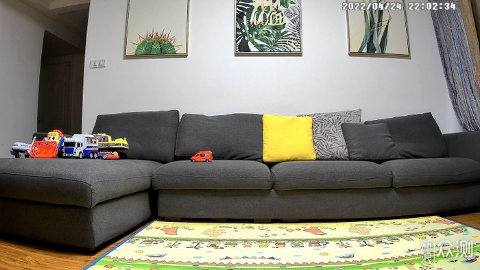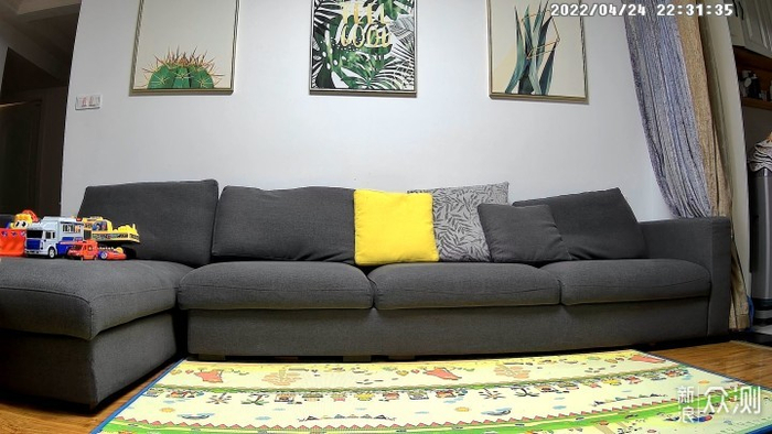 放两张同时段开灯和不开灯的对比图就可以看到,夜视情况下,物品的轮廓还是非常明显的,连宝宝玩具车的车窗细节都看得清,监控效果并没有受到光线的影响。