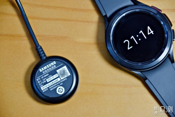 标配磁吸无线充电底座,5V、1A 的输出功率有些偏低,给 361mAh 容量的手表充电需要 2 小时才能充满,平均续航一天半左右。很可惜对当下的无线充电协议不兼容,使用其他无线充电设备不能给其充电。