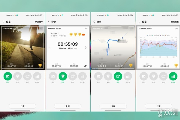 很多人喜欢跑完步分享内容,三星健康APP 在这方面做得也很好,提供了多种数据形式分享,有感性的图片分享,也有理性的数据分享,满足不同的人群需求。
