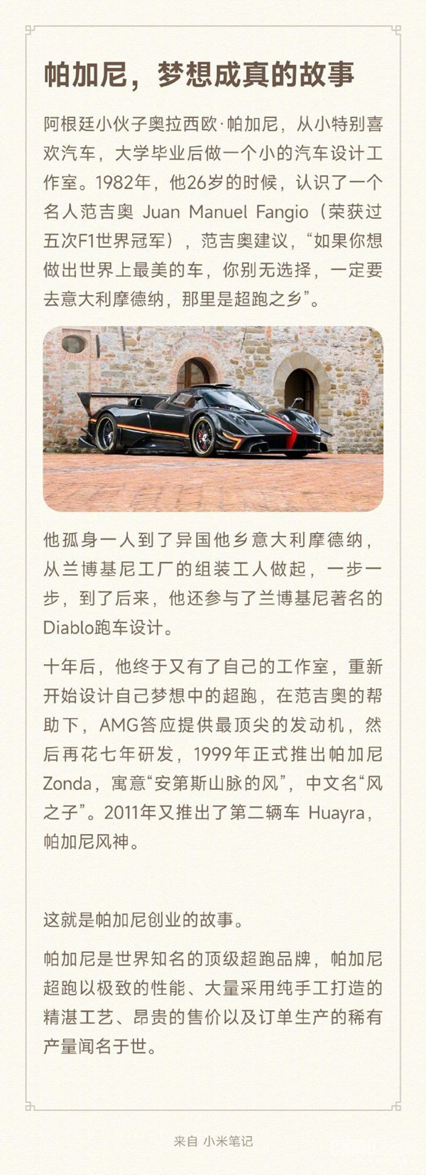一位阿根廷小伙奥拉西欧·帕加尼从小特别喜欢汽车,为了做出世界上最美的车,1982年,他孤身一人来到了意大利跑车之乡摩德纳,从兰博基尼工厂的组装工人做起。十年后,小伙子创办了自己的公司,并于1999年推出了第一辆车,帕加尼Zonda(风之子)。2011年推出帕加尼Huayra(风神)。仅20年就成就世界知名的顶级超跑品牌。这就是帕加尼创业的故事。