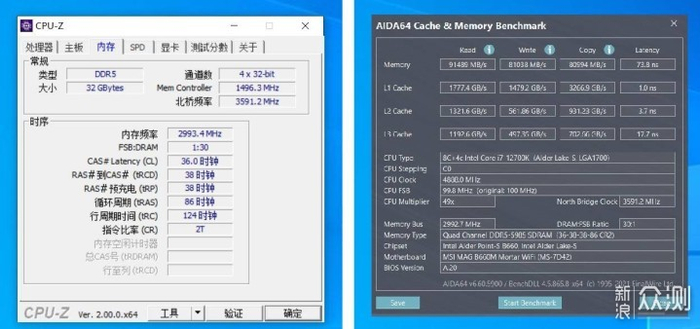 再次顺利进入系统,运行CPU-Z,看到内存频率已经是6000MHz,时序分别是36-38-38-86。读取91489MB/s,写入81038MB/s,复制80994MB/s,比起之前大幅提升,同时延迟也降低到了72.8ns,表现还是很惊人的。