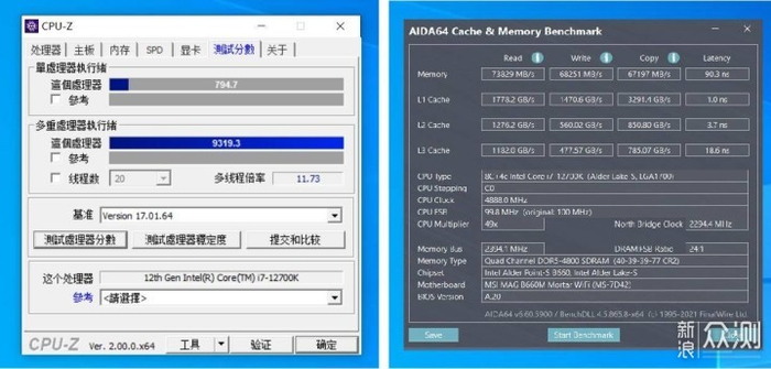 使用AIDA64软件测试内存表现,读取是73829MB/s,写入是68251MB/s,复制是67197MB/s,延迟90.3ns。这个读写复制的表现比起DDR4内存要高很多,毕竟频率达到了4800MHz,不过时序较高。