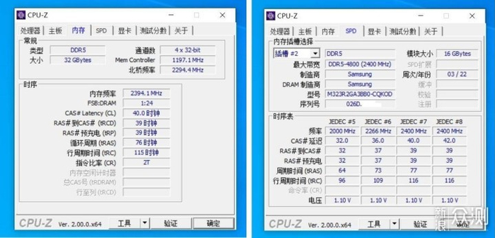 CPU-Z下显示内存频率是4800MHz,时序是40-39-39-76,而内存的最大带宽显示为4800MHz,时序40-39-39-77。颗粒自然是三星颗粒,而制造商,也显示为三星。