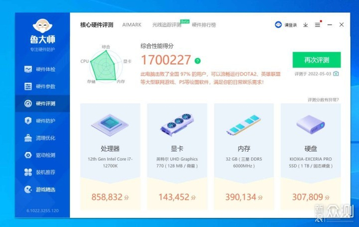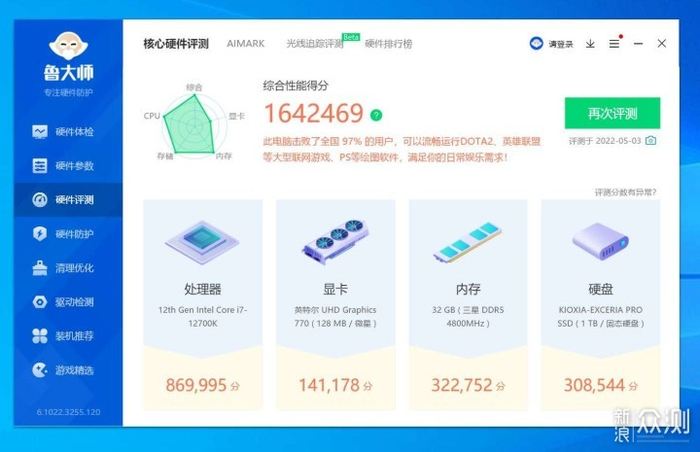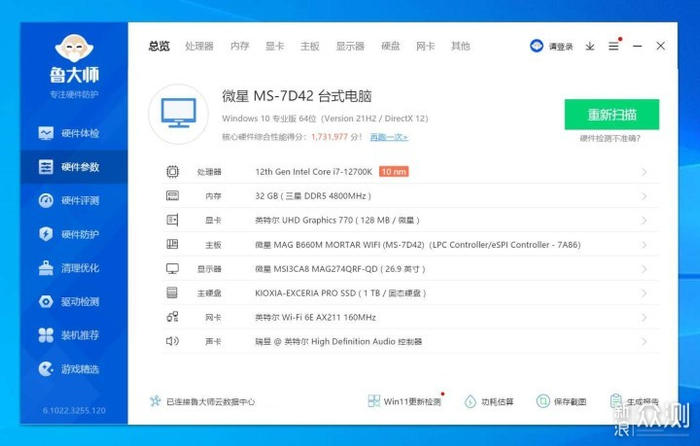运行鲁大师,可看到内存一项显示为32GB三星DDR5 4800MHz。