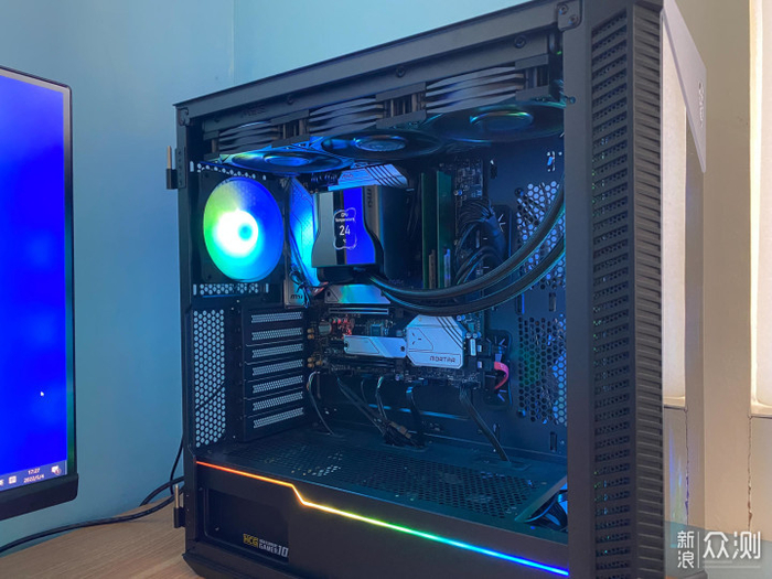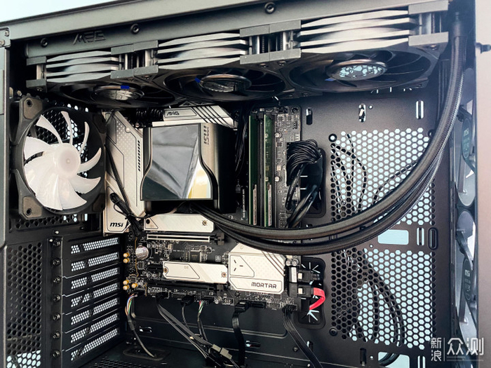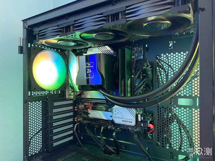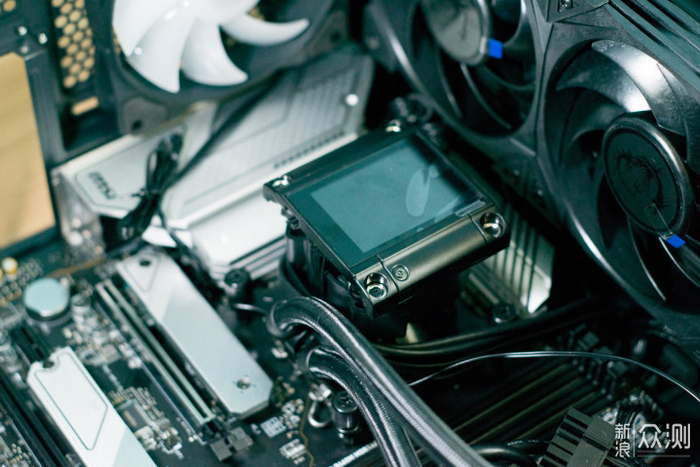 将主板安装好,然后是水冷散热器,水冷是微星的MAG 战神S360水冷,CPU是Intel 12700K。这款战神S360水冷,做工扎实,材质优秀,,安装简单容易。独特优异的设计,冷头除了水泵还设计带有风扇对周边器件风冷散热,表现了良好的冷却能力。冷头带有IPS屏幕,可以显示电脑的各种参数,显示图片、视频、动画等,感觉不凡。
