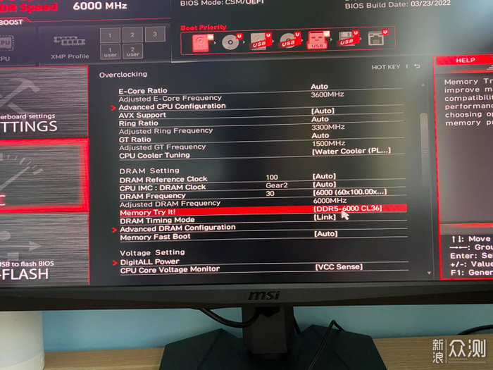 下面就要尝试超频了,重启进入到BIOS。在BIOS里,可以看见金百达这款DDR5内存似乎冰不支持支持XMP3的超频方式,不过没有关系,还有其他的超频方式,微星的主板具有memory try it功能,我们直接选择到了6000MHz,这也是很多DDR5内存开启XMP后通常达到的数值。