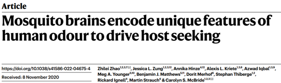 [2] Mosquito brains encode unique features of human odour to drive host seeking。 Nature (2022)。 DOI: 10.1038/s41586-022-04675-4