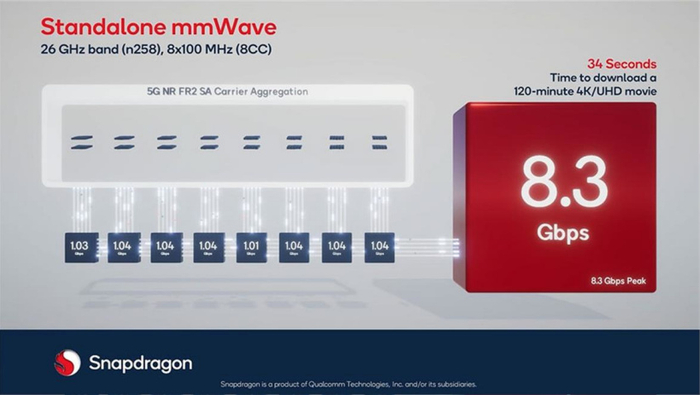 高通强调,Snapdragon X70 5G 毫米波独立组网连接部分,最高传输速度可达 8.3Gbps (n258 26GHz 频段、8 组 100MHz 频宽组成),大约可在 34 秒内完成下载一部长达 120 分钟的 4K UHD 画质影片。