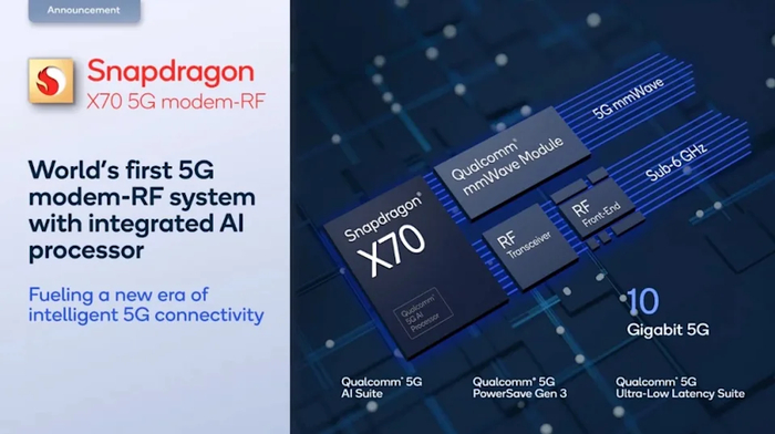 今年 2 月,高通正式发布了骁龙 X70 调制解调器及射频系统,并引入全球首个 5G AI 处理器,支持高通 5G AI 套件、高通 5G 超低时延套件、第 3 代高通 5G PowerSave 和 Sub-6GHz 四载波聚合等先进功能。