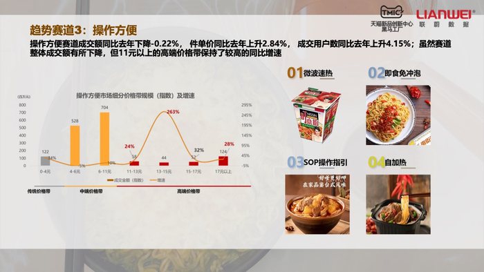什么是“口味还原”?比如原汤原汁的新口感,冻干锁鲜的新技术或高端食材的新配置。主打口味还原的方便面,去年在天猫平台成交额同比上升32.01%,成交用户增加32.01%,平均单价也提高了8.02%。什么是“健康养生”?比如零添加、低卡路里或营养添加。主打健康养生的方便面去年成交额同比上升17.52%,成交用户增加80.08%。什么是“操作简单”?比如微波速热、即食免冲泡或自加热。主打操作简单的方便面去年在高端价格区间同比增速较快。什么是“地域特色”?是那些依循各地风土人情的方便面,比如韩国部队锅、湖北热干面、山西刀削面等。去年,主打重庆小面的特色方便面成为大赢家,成交额同比增长56.9%。