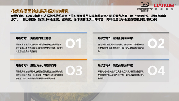 关注这些消费群体的需求,有助于行业实现更好的产品定位。例如,Z世代更青睐复杂口味和DIY口味,新锐白领倾向于创新口味、海鲜和麻辣口感,精致妈妈则重视健康养生和DIY口味,资深中产群体更看重原汤原味、清淡鲜美和健康天然。另外,从趋势上看,消费者在免煮即食类型方便面上的消费增长更快。
