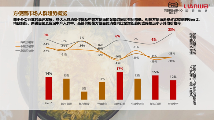 通过平台数据,方便面产业可以精准定位消费群体。尽管外卖行业的迅速发展让中低价位方便面销量不断下滑,但Z世代人群、精致妈妈、新锐白领和资深中产对高端方便面的消费并没有停滞。特别是精致妈妈和资深中产两个消费群体,前者占方便面消费人群的17%,后者占12%。他们对于中低价方面的需求大幅下降,但消费高端方便面的金额都在增长。