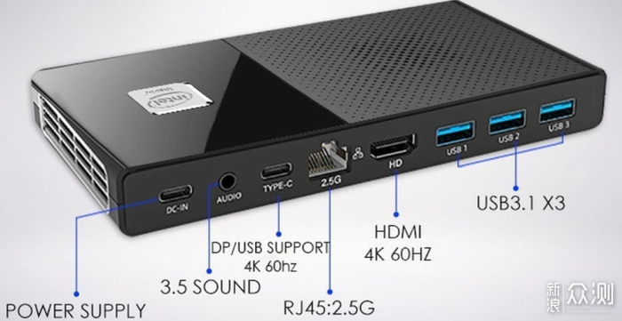 尽管机身小巧,接口方面可是一点不吝啬,包含1个HDMI 2.0,一个支持显示输出的多功能Type-C,1个连接电源的Type-C,3个USB 3.1 Gen2规格的USB-A,1个3.5mm音频接口和1个2.5 Gbps的网口。除了有线上网之外,这款口袋迷你主机还内置了英特尔AX201无线网卡,支持WiFi6和蓝牙5.2。