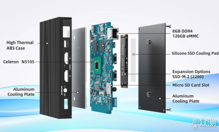 机器包含了两个处理器的版本:TDP为10W的英特尔赛扬N5105四核四线程处理器,以及TDP为6W的赛扬N5100四核四线程处理器。8/16GB的板载DDR4-2933MHz内存。机身内部有两个m.2的接口,可以安装一个m2.2280规格的NVMe固态硬盘和一个m2.2242规格的SATA固态硬盘。同时,它甚至还内置了主动散热的风扇,保证长时间运行中系统的稳定性。