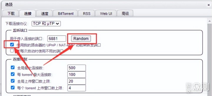 ▼qbit默认的监听端口是6881,大多数PT站点是屏蔽掉的,为了下载有速度,咱们这里随便roll一个用于传入连接的端口,同时开启UPnP功能转发端口,下载就能跑的起来了。