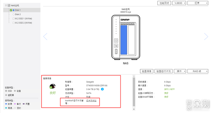 ▼容量为4tb及以上的酷狼和酷狼Pro支持IHM(希捷酷狼健康管理软件),在威联通QTS上当打开硬盘管理时就会看到可爱的狼头,从目前来看酷狼还是独一家。IHM可以提高NAS系统的稳定性,主动保护数据健康,确保NAS硬盘的健康运转。
