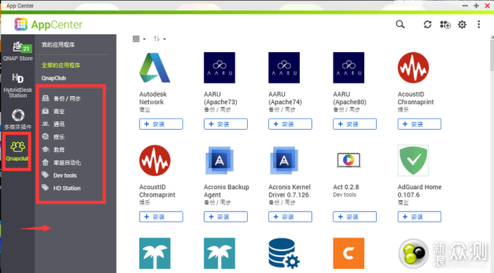 ▼添加之后我们可以看到在最左侧的标签栏多出了一个名为qnapclub的软件源,这样我们就可以在里面快捷方便的安装应用了,找到qBit和Tr进行下载安装吧。