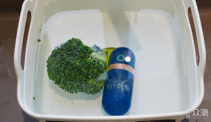 ▲用功率最低只有8W的无线单仓果蔬清洗机对半颗西兰花进行除菌工作。(已从理论上证明果蔬清洁机确实能除菌,因此如果无线单仓款能做到延长蔬菜存放周期。那么功率更高的大宇和摩飞效果一定更好)