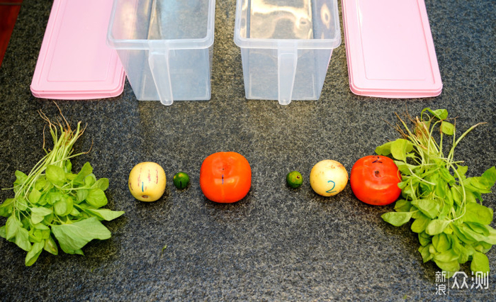 ▲在编号1的蔬菜、水果容器内放入臭氧发生器并放入冰箱,2号常规方式储存在冰箱内。4天后结果能证明臭氧除菌对延长瓜果保存周期起到作用。