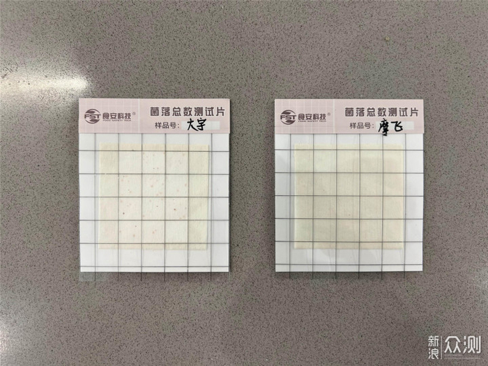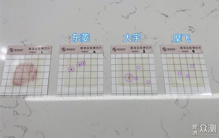 ▲恒温36℃培养24小时后的细菌总数测试片,结果非常明显。没有烘干功能的大宇在潮湿环境下净化仓钛电极上容易滋生细菌。而摩飞由于用完就能及时烘干,细菌并没有滋生多少。