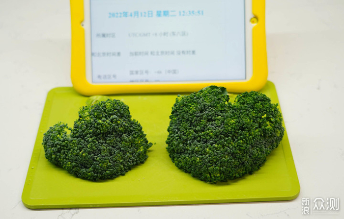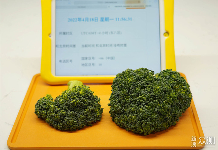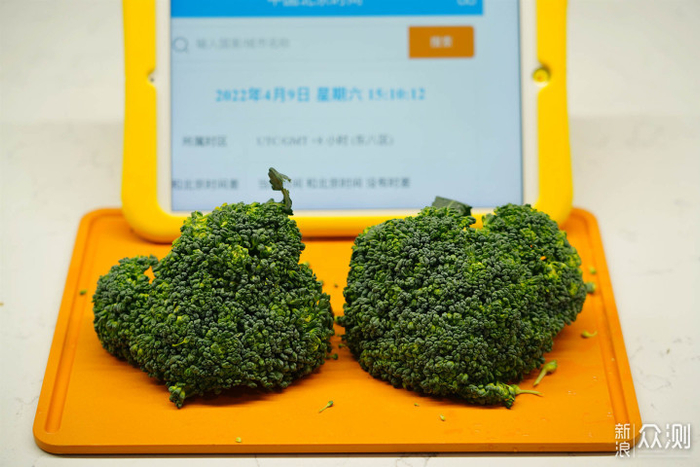▲买了颗西兰花一切二,右侧西兰花用果蔬清洁机清洗并除菌,左侧保持不动。