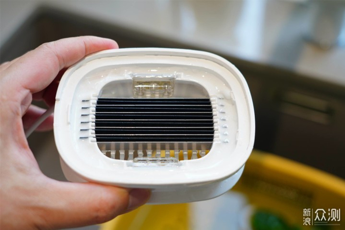 ▲无线款,头部的网状钛电极特写。它是5V供电,功率较小只有8W。所以官方描述中阐述3~5L水工作一次、6~10L水建议工作两次。可见,如果蔬菜多了,效率和效果都会降低。