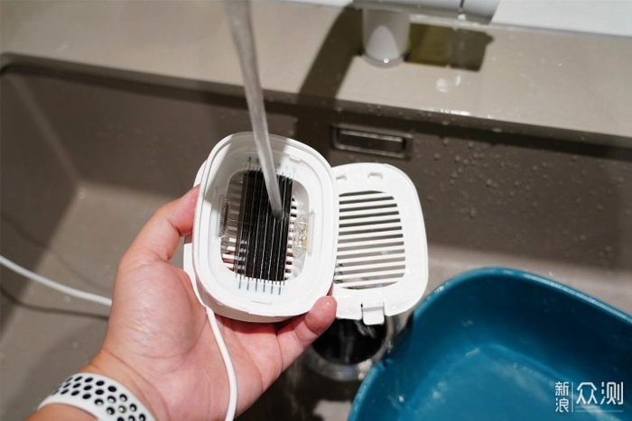 ▲无线款果蔬清洗机由于小巧,收纳极其方便。甚至外出游玩时都能塞入包包内。但是它的多孔结构和网状钛电极在清洗肉类沾上的油脂时就显得有些便了。