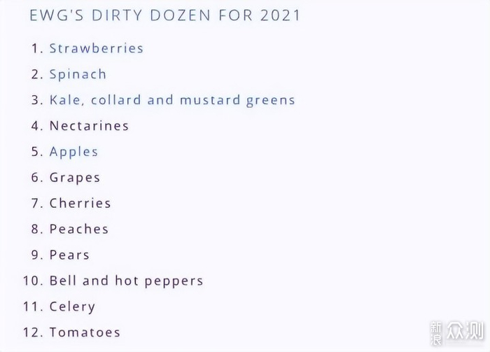 美国环保工作组织(Environmental Working Group,简称EWG)在2021年针对47种流行水果和蔬菜中的农药(杀虫剂)污染进行调查,排列出12种最脏蔬果清单。