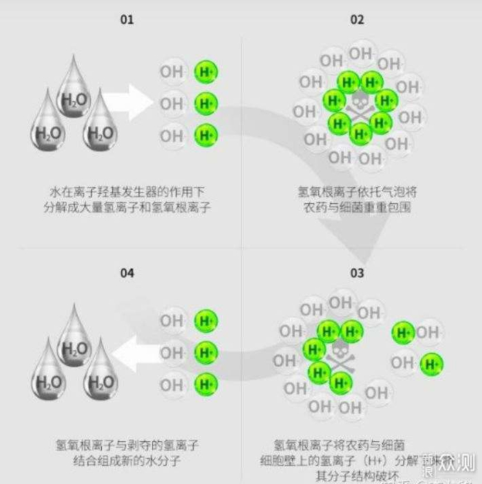 ▲上面图示就是水羟基技术原理图。简单来说自来水在离子羟基发生器作用下分解为H+氢离子和OH氢氧根离子。