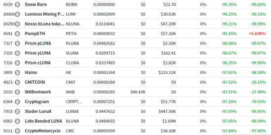 在LUNA币闪崩下,包括比特币、以太坊在内的加密货币同样经历血雨腥风。5月12日,当天还有数十只虚拟货币跌幅巨大。