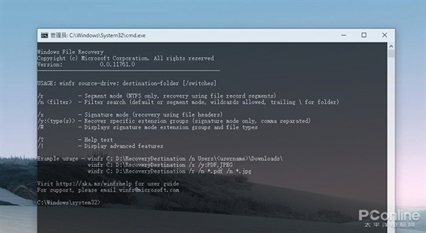 需要注意的是,Windows File Recovery 没有图形界面,需要通过命令行使用,但并不难。它的命令语法是: