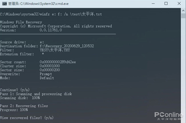 例如,我们要将 E:\test\ 下一个名为“太平洋。txt”的文件找回来,具体命令就是:winfr e: d: /n \test\ 太平洋。txt。