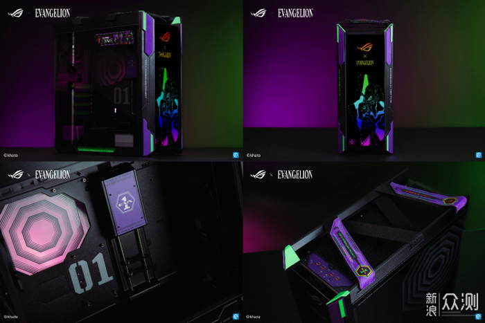 首先介绍的是整体外部装甲部分——ROG STRIX HELIOS 太阳神机箱 新世 纪福音战士丨限量版。其外部装甲以ROG太阳神为主体,辅以EVA初号机经典紫绿配色,将初号机形象整体展现于前面板,顶部绑带还特别采用初号机紫色为主色调,并印有“ROG x EVANGELION PROJECT”字样和EVA 01 图案。内部PCIE挡板、底部的金属格栅、多功能支架和电源仓盖都巧妙融入了EVA元素。特别是机箱背侧的玻璃板印刷的AT力场纹路,与主板的AT力场纹路相呼应。