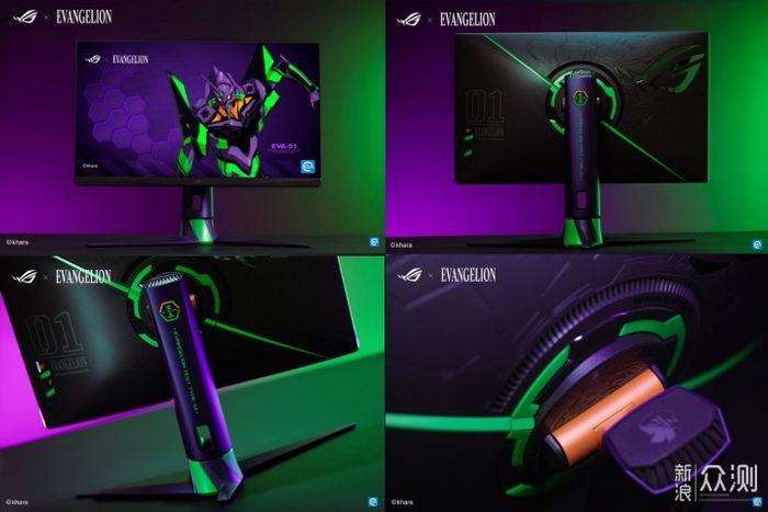 ROG STRIX XG27AQM绝尘电竞显示器新 世纪福音战士丨限量版,整体采用了标志性的紫绿配色,背部ROG信仰LOGO调整为紫色后,可以与EVA元素更加浑然一体;搭配绿色“一刀流”斜切设计,霸气尽显。同时,这款电竞显示器还采用了旋转铠甲支架环设计,其灵感来源于初号机核心铠甲造型,棱角分明,硬核机械感油然而生。此外,显示器支架也以初号机手臂形象为蓝图,强有力的支撑感也塑造出了生生不息的生命力意象。