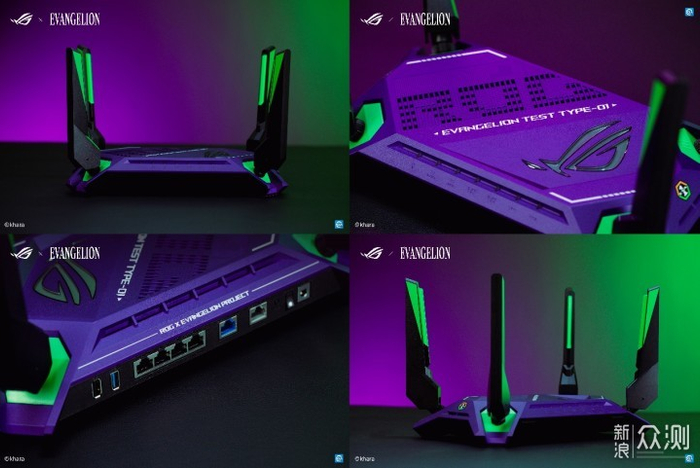 当然,ROG GT-AX6000电竞路由器新世 纪福音战士丨限量版也不能少!其外观采用绿、紫标志性配色,瞬间唤起粉丝们心底的激情;别具一格的绿光天线,可根据网络信号强弱自适应调整灯光亮度;机身紫色涂装,印有初号机型号标识,配合醒目的战意之眼,释放出不容置疑的强大气场,尽显凌厉,BUFF加满!