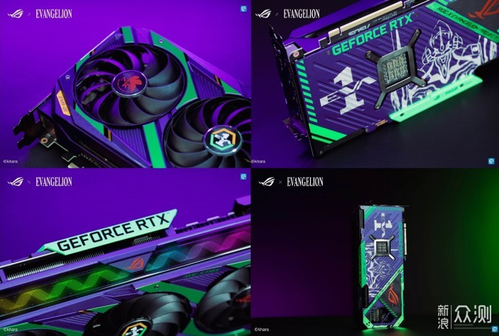 显卡作为整机中的性能担当,和主板一样选择了EVA的初号机风格进行设计,基于ROG STRIX的设计理念,将初号机的紫色和绿色融入原设计之中,金属风质感的外观展现出绝佳的制造工艺,同时搭配了交错的纹理十分富有质感。显卡正面风扇中央金属贴增加了NERV基地和初号机的Logo,直接亮明的EVA初号机设计元素。侧边的波纹图形灯带参考了原作中EVA机体和驾驶员的同步率波形,象征了显卡会向着更高的频率冲击,同时还支持AURA SYNC, 灯光自定义可以创造出专属显卡造型,可与其他ROG x EVA装备同步灯效。