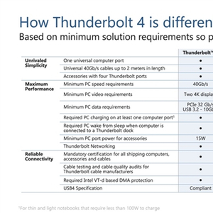 虽然雷电4依然是40Gps带宽(双向),可PCIe链路从雷电3的16Gbps增加为32Gbps,且必须支持双4K或者8K显示输出,还支持四口雷电扩展坞、从睡眠唤醒以及虚拟机的Intel VT-d DMA(直接内存访问)保护,所以不要单纯从带宽,认为雷电3到雷电4只是换马甲。