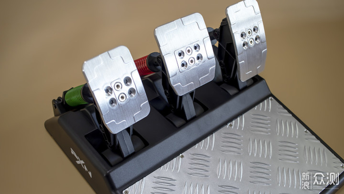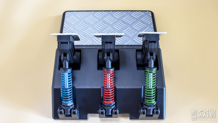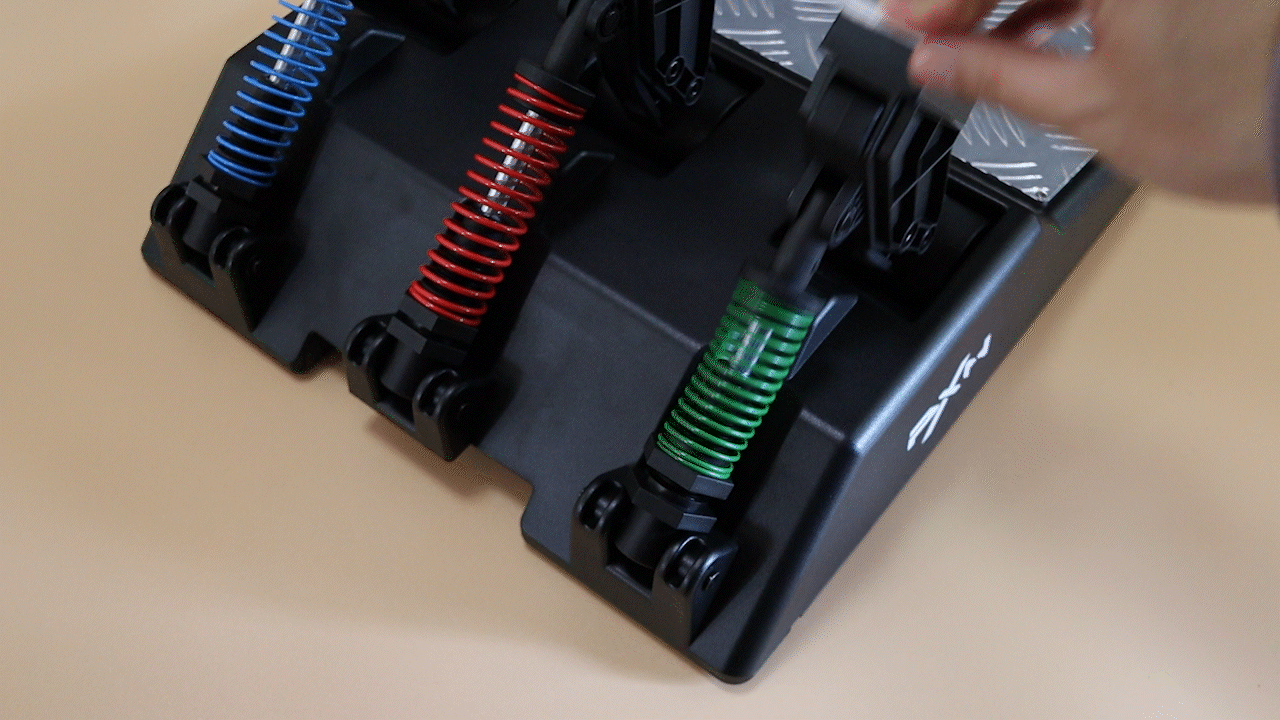 这个脚踏最厉害的地方在于不仅每个踏板的高度可以调节,同时反馈力度也可以通过后面弹簧下面的螺丝进行调节。不管是方向盘的调节还是脚踏,这样的设计只为了最大化的提升真实的游戏体验。同时脚踏内部的霍尔感应也带来更加真实细腻的驾驶感受。