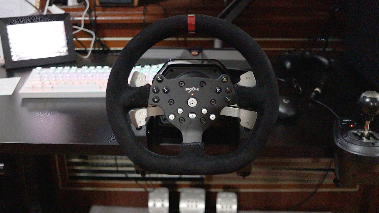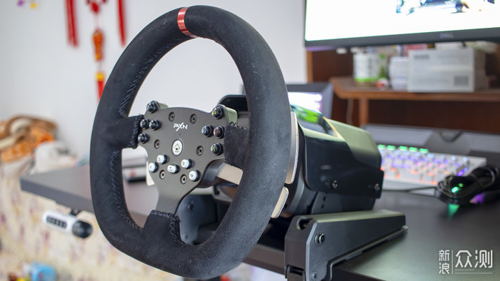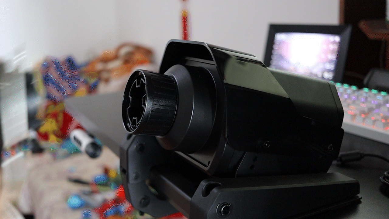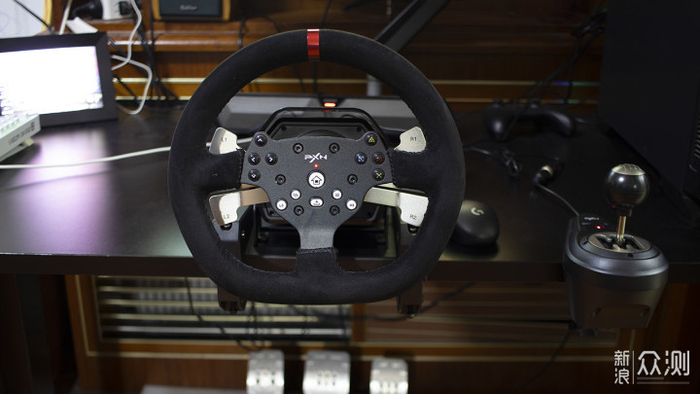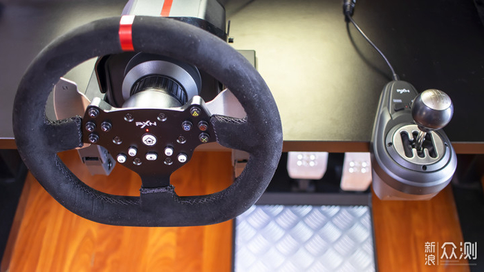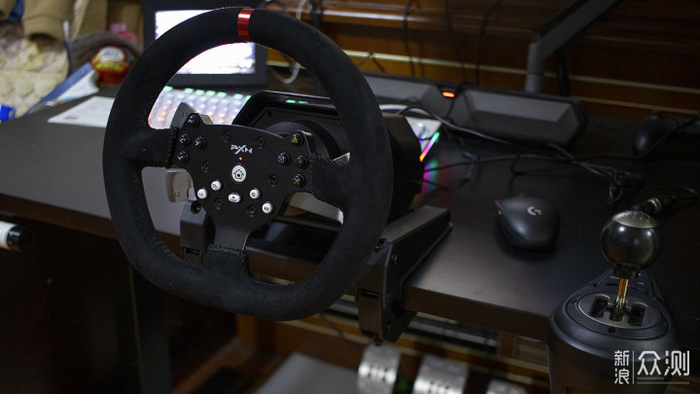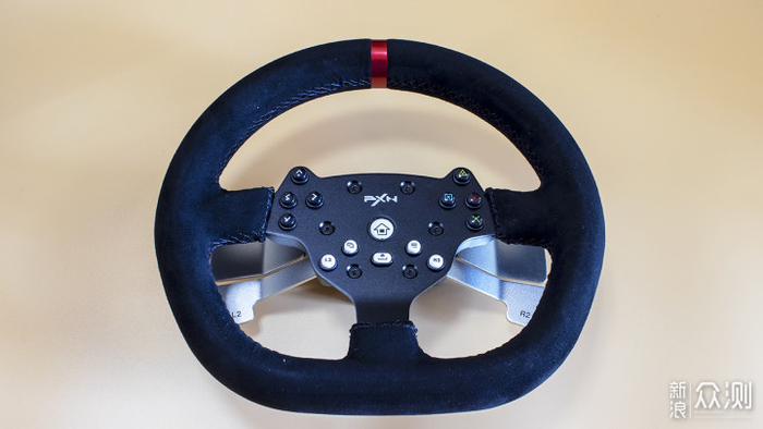 这套游戏拟真设备中最重要的就是这款方向盘了,可以看到本体由两部分组成,分别是方向盘盘面和方向盘本体,第一感觉是这套设备质感十足,金属材质的盘面提供了丰富的按键,通过自定义操作可以实现非常便捷地操作,盘圈则覆盖了翻毛皮材质,手感非常不错,和自家车上的方向盘套手感一致,在这个价位做工真的没得说。盘面背部还提供了四个金属拔片,尺寸刚好手感有清晰的段落感,赛车游戏必备。