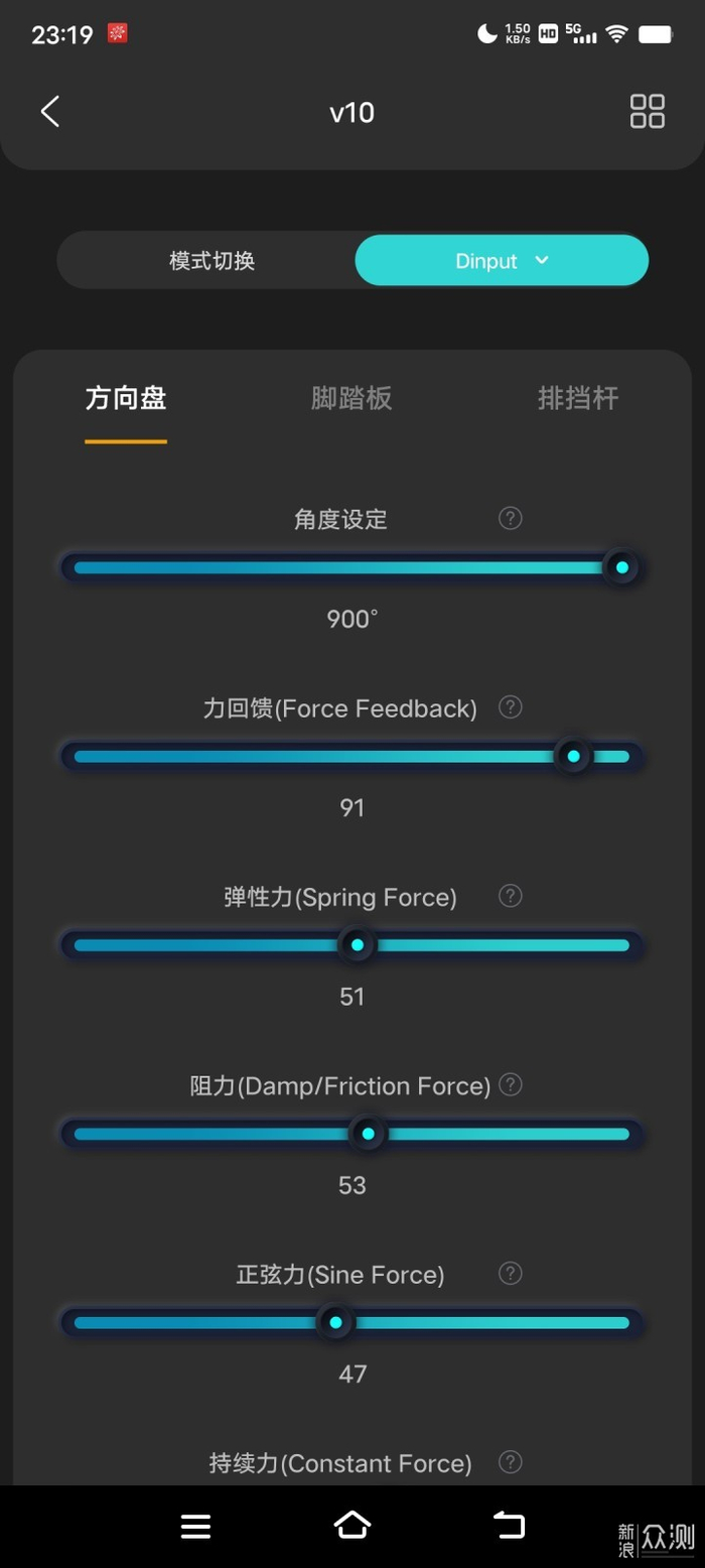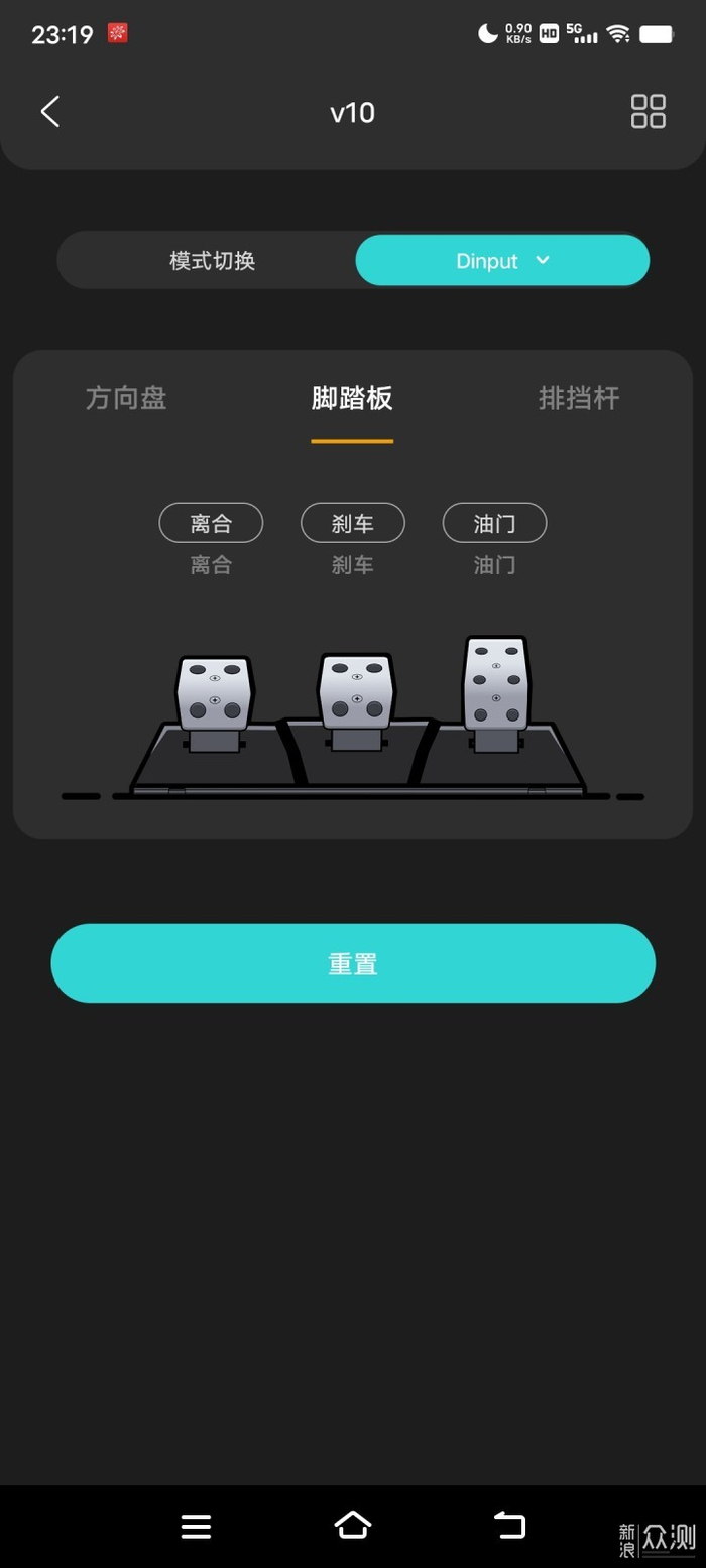 设备是通过蓝牙连接到APP的,可以分别对方向盘,脚踏,挡杆进行设置,不过如果是安卓用户要注意下,貌似是下载链接放错了,直接下载的并不是设置APP,我是通过店铺客服沟通进行APP下载并更新到最新的固件的。