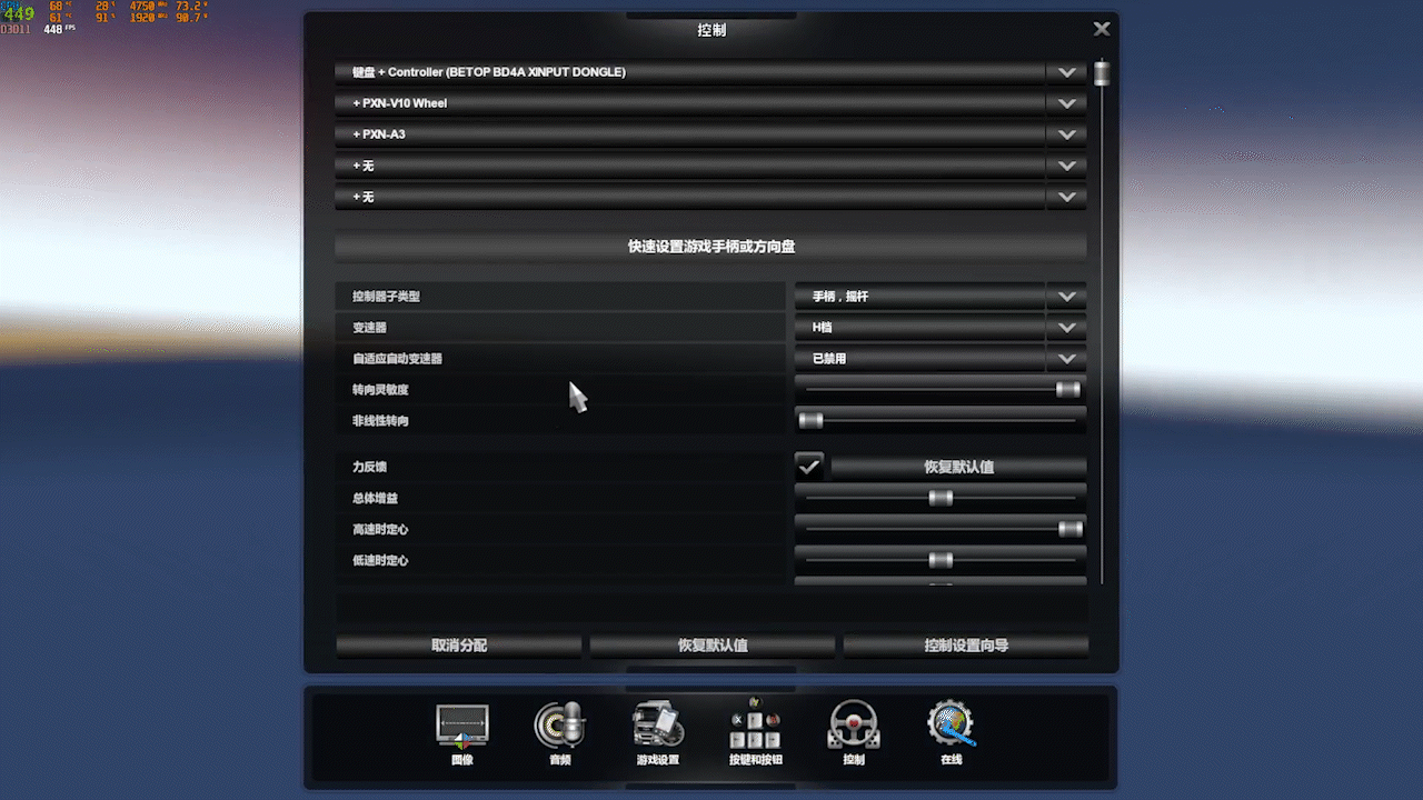 游戏完美匹配,同时设置非常简单,可以看到直接识别出来莱仕达方向盘,设置完毕后就可以正常游戏了。不过要注意接入电脑后方向盘转动会很重,需要在游戏内进行相关的设置。